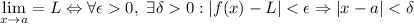 | \lim_{x\to a} = L \Leftrightarrow \forall \epsilon > 0 ,\ \exists \delta > 0 : \\ | f(x)- L | < \epsilon \Rightarrow | x - a | < \delta |